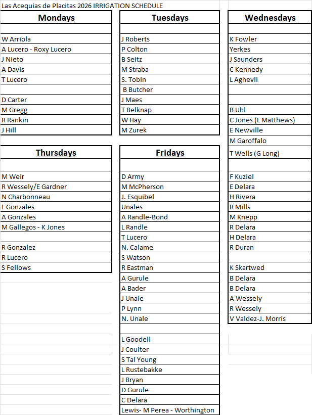 The Mayordomo plans to irrigate this Monday, Wednesday, and Friday. Please be aware that due to low spring outputs, the ponds may not recover sufficiently to proceed, or they may empty before the run is complete. I will stay in touch with the Mayordomo and pass on information as I receive it.